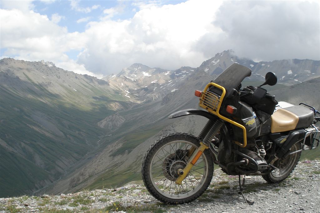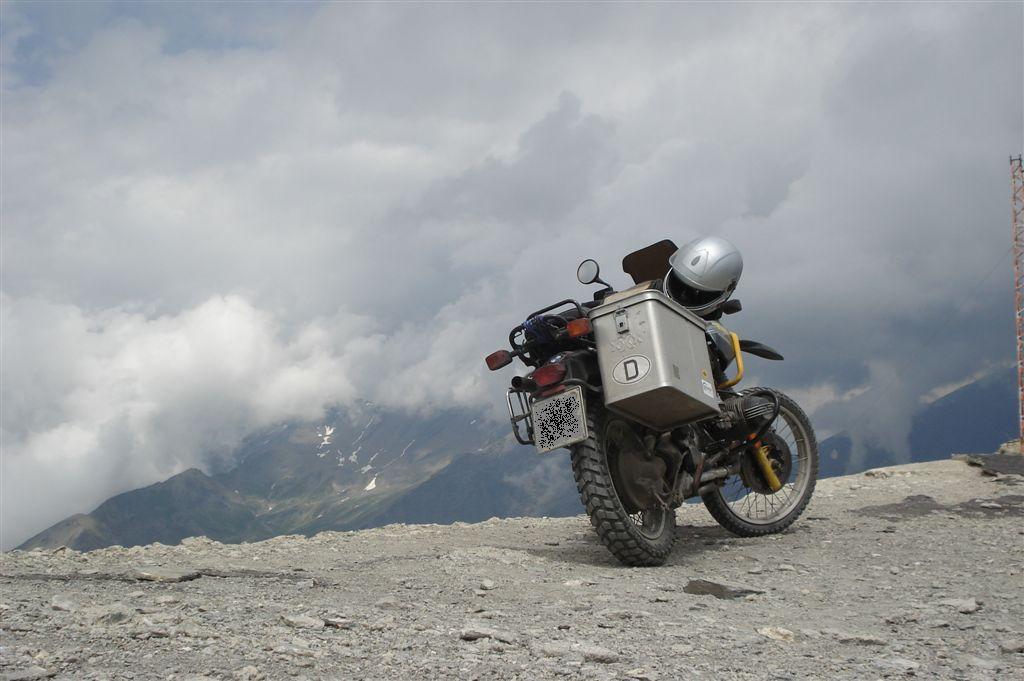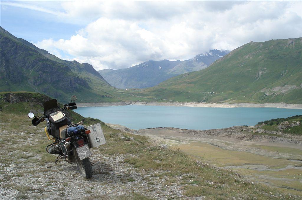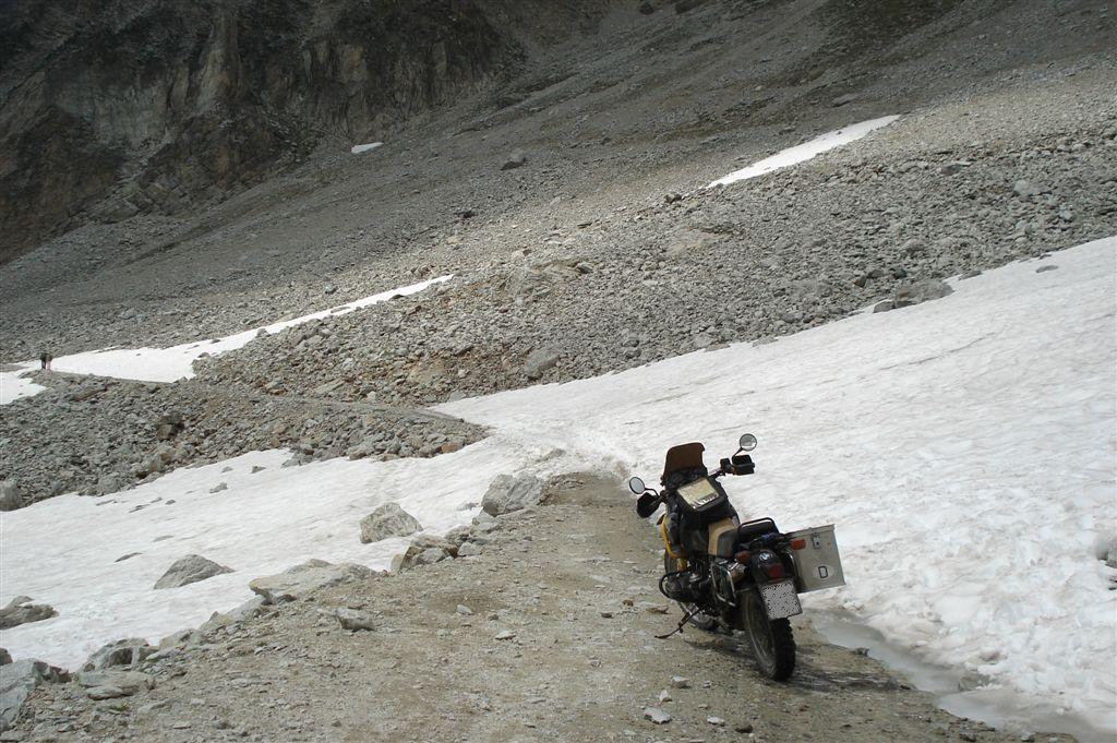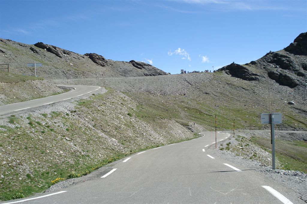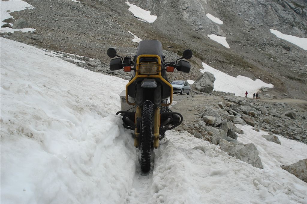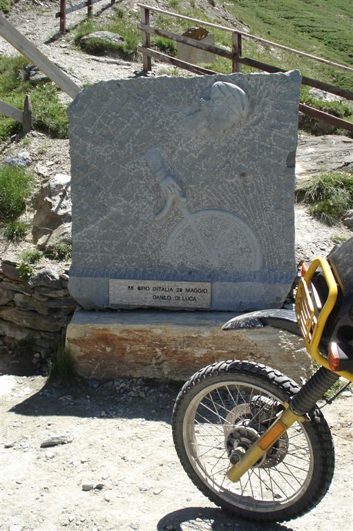 Gleich nach Ankunft bei schönstem Wetter. Ist Fr.-So. 9-17 Uhr gesperrt. Stichstraße zum Colle, höchster mit Motorfahrzeugen anfahrbarer Punkt in Europa (3000m). Die letzten Meter waren durch ein Schneefeld nicht passierbar, jedenfalls nicht für mich und die Kuh. Eine Spur war gefahren, aber nur mit zusätzlichem Schiebeeinsatz zu bewältigen, was ich später auf dem Zeltplatz von einer geführten Gruppe erfuhr (Sportenduro).