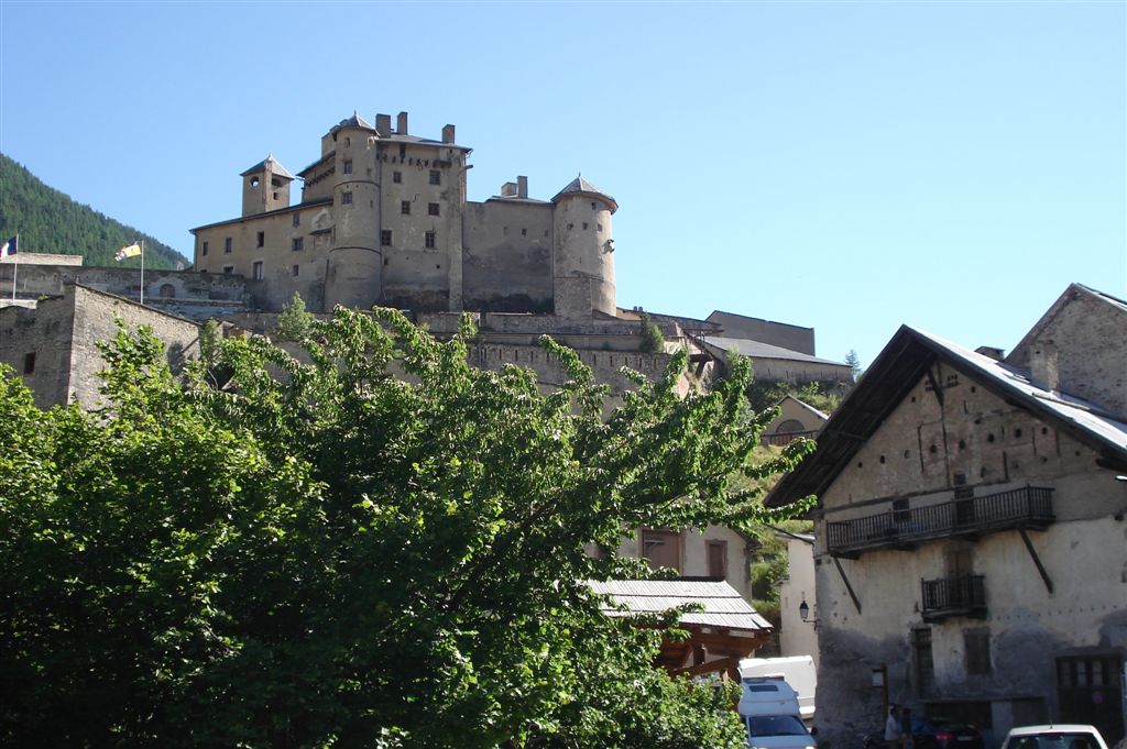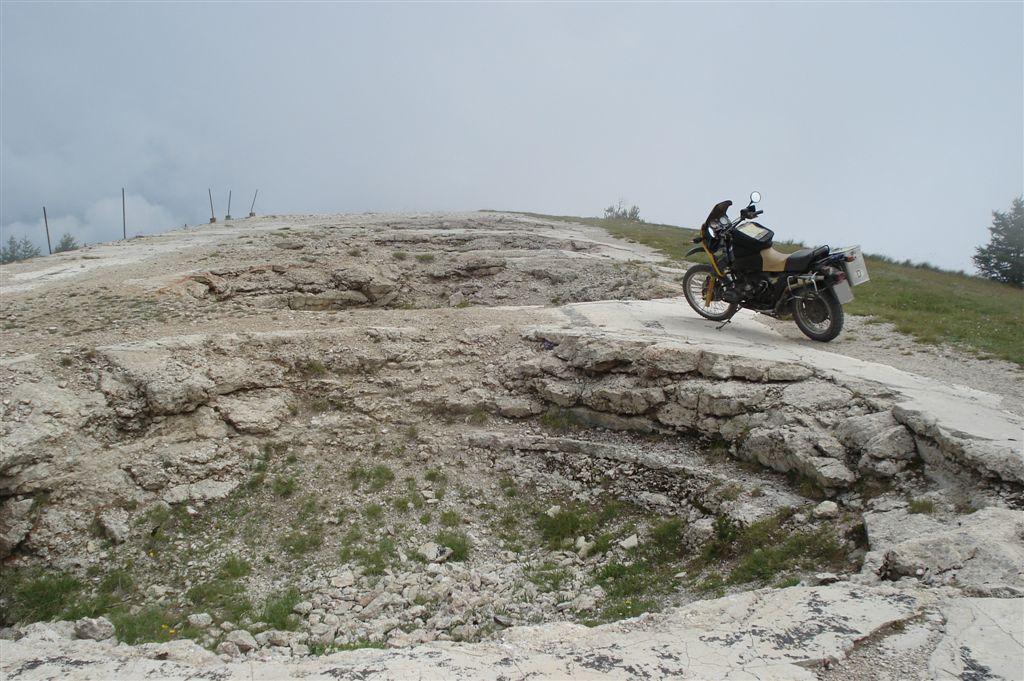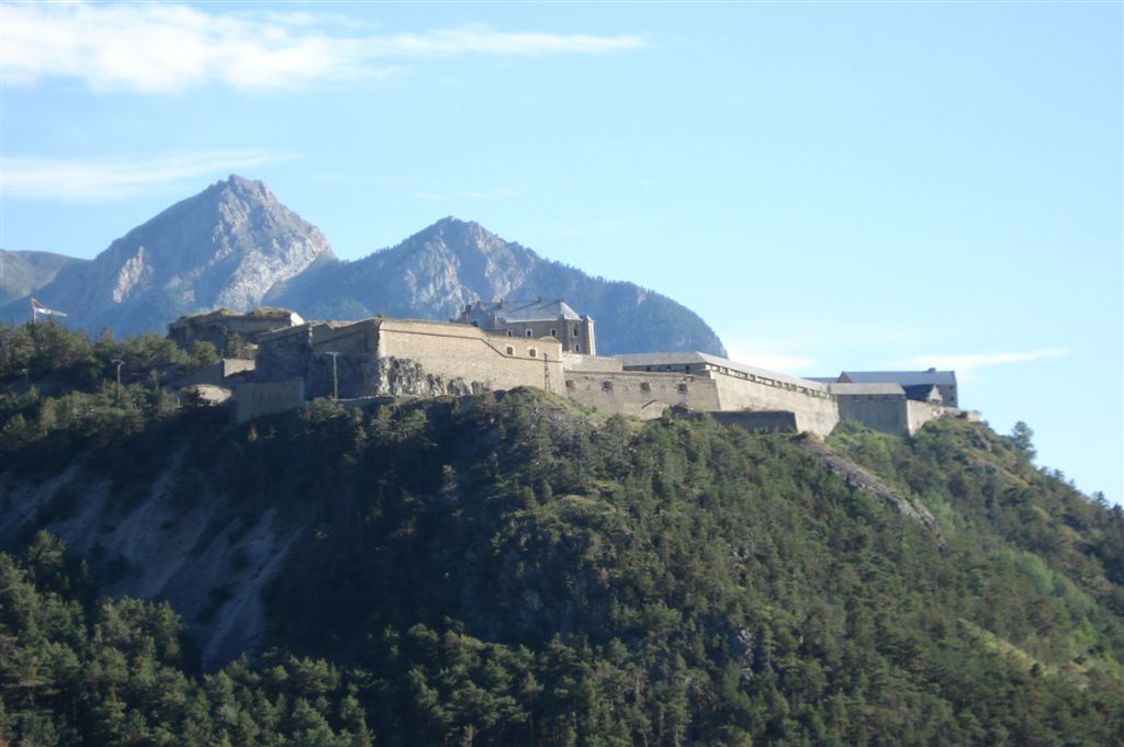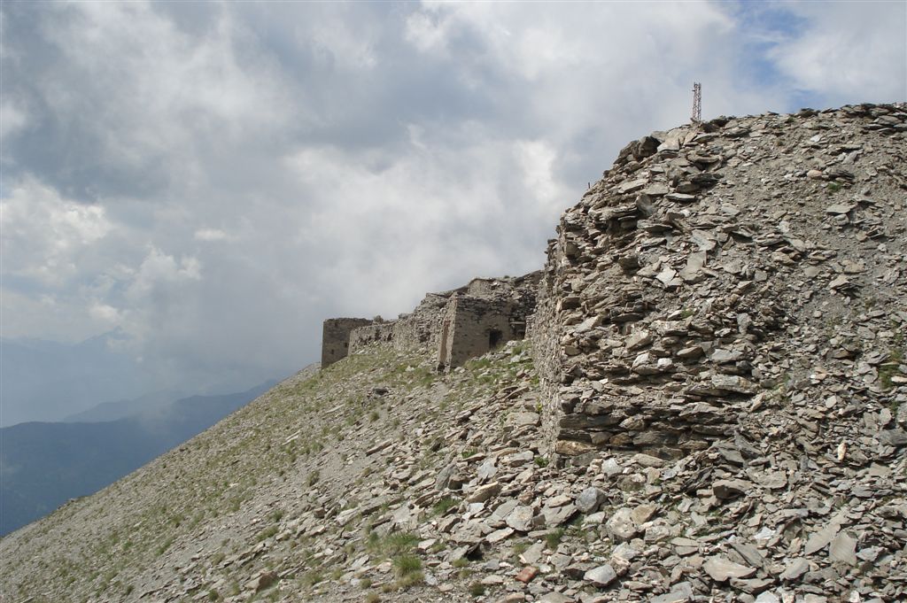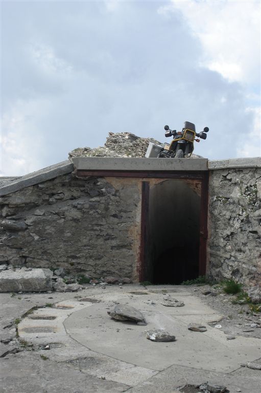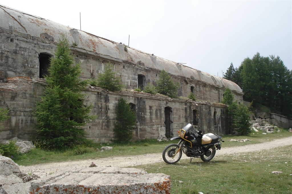 Von weitem war schließlich das Fort Jafferau schon zu erkennen nebst unterhalb gelegener Mannschaftsunterkünfte. Erstmals zeigte sich hier die urspüngliche Befestigung der Militärstrassen. Sie besteht aus zentimeterdicken, vor Ort gewonnenen Steinplatten mit einer geraden Kante, die einfach senkrecht und quer in den Boden gesetzt wurden. Sehr stabile Sache, aber auch sehr holprig, da die Kanten mit der Zeit und durch die Belastung teilweise ausbrechen. Teilnehmer der geführten Motorradgruppe traf ich abends auf dem Zeltplatz wieder. "Der Stehlin" (bekannter Motorrad-Reiseveranstalter aus dem freiburgischen) war wohl selbst oben.
