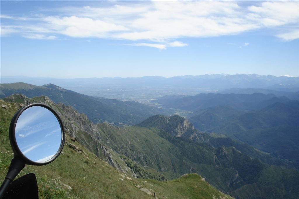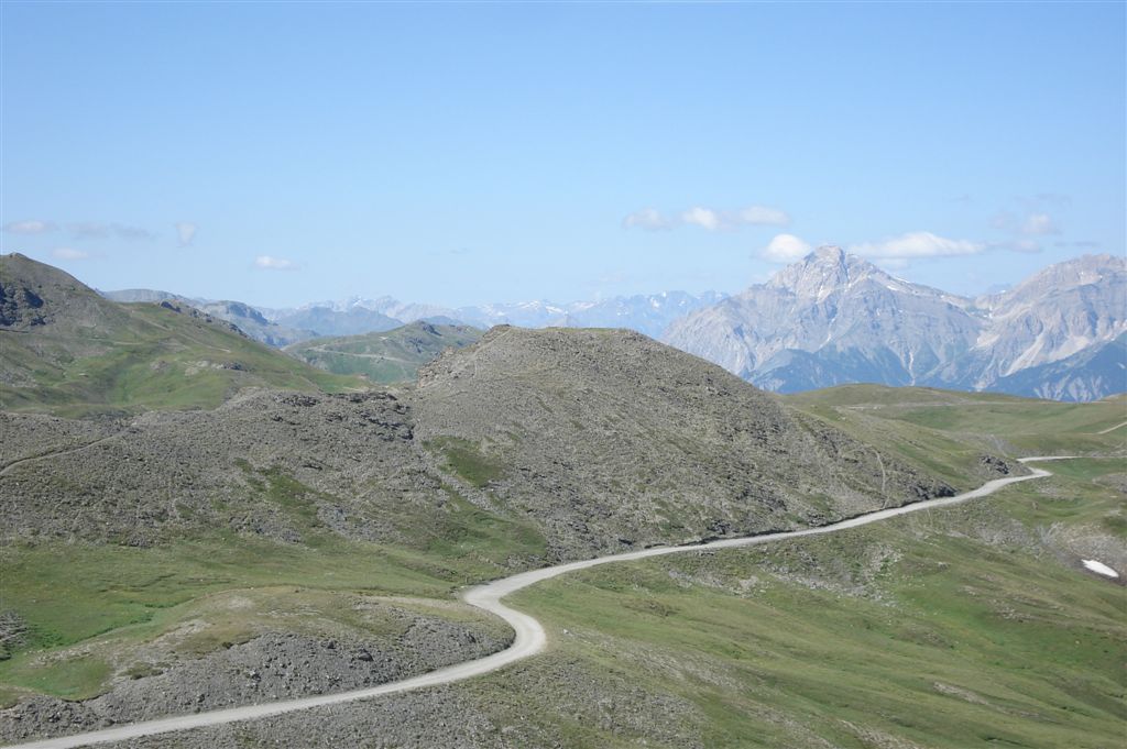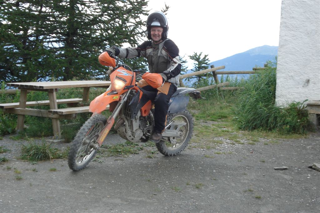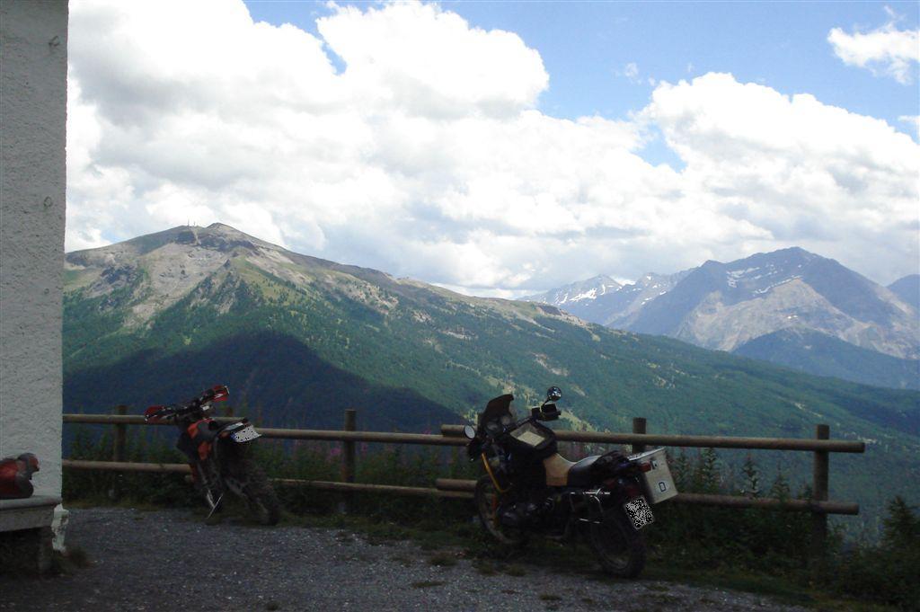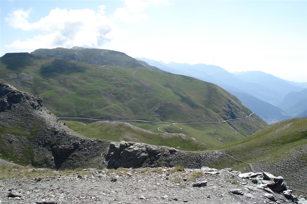Insgesamt sehr schöne Aussichten auch in die italienische Tiefebene. Unterwegs führten drei Italiener, alle auf Großenduro unterwegs, den gekonnten Umgang mit denselben auf grobem Schotter vor. Es geht wohl doch einiges mehr bei entsprechendem Zug am Gas. Die intensive Nutzung der niederen alpinen Wiesen durch Beweidung hinterläßt fast noch größere Flurschäden als das Querfeldeinfahren, was natürlich nicht heißen soll, dass letzteres nicht so schlimm sei. Abstieg ins Tal über Asphalt und durch selbiges den gleichen Weg zurück zum Zeltplatz.