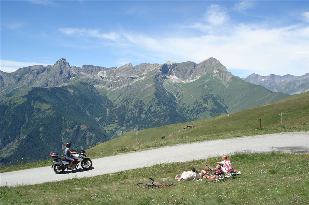 Kurz vor Ende überholten mich noch meine Zeltnachbarn. Gesehen haben sie von der Landschaft bei dem Tempo sicher nicht viel. Später auf dem Zeltplatz wurde berichtet, dass sie sich bei einigen "Lockerungsübungen" abseits im Gelände gegenseitig filmten. "Eh, Ralf, wie hieß der Colle gleich, den wir gefahren sind? War das der 410er (das ist die Denzel-Streckennummer, und ja, Ihr wart auf der Assietta)?" Ohne Worte...